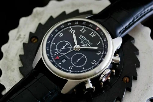The Codebreaker takes inspiration from the watches which would have been worn by Officers in the 1940's, bringing classical plainness to this new piece. A new calibre, the BE-83AR has been devised using a Valjoux 7750 but a lowering of the twin counters results in a new perspective which allows enough room for the Bremont logo to enjoy its own area of dial space. The date window between the 30-minute totaliser and the running seconds adds symmetry and the GMT hand with its elongated red arrow tip provides its own quirkiness.